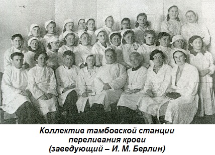 Нагрузка на госпитали привела к резкому увеличению потребностей в донорской крови. Под руководством главного врача И.М. Берлина в июне 1941 года прорабатывается план мобилизации Тамбовской областной станции переливания крови. В эти суровые годы она сыграла большую роль, бесперебойно обеспечивая консервированной кровью и стандартными сыворотками Брянский и Воронежский фронты, десятки госпиталей и всю сеть гражданских медицинских учреждений. В помощь областной станции была создана станция переливания крови в Мичуринске и 4 кабинета переливания крови в других городах.
