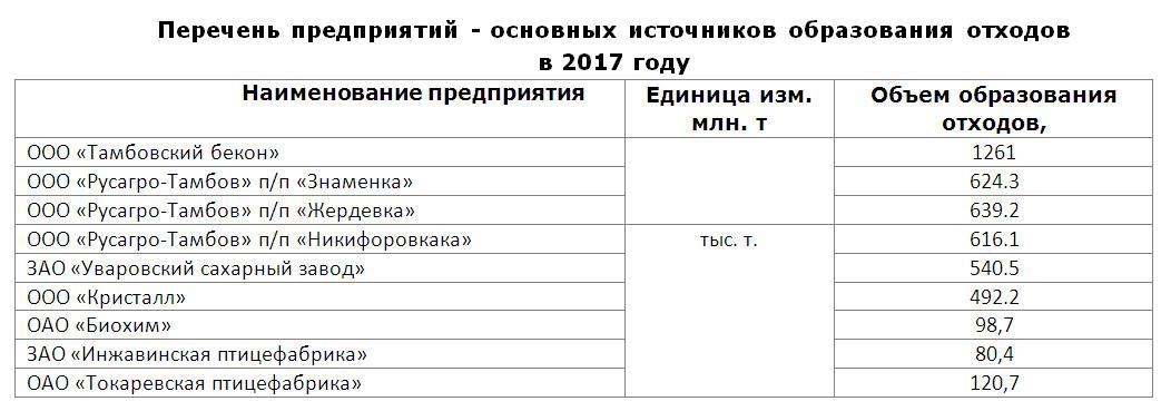 Основные источники образования отходов в 2017 году животноводческие комплексы (ООО «Тамбовский бекон») и предприятия перерабатывающей отрасли (сахарные заводы ООО «Русагро-Тамбов»).