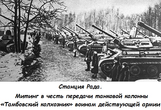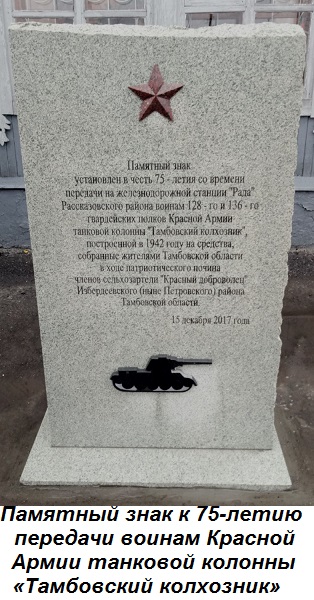 15 декабря 1942 года стало знаменательным днём в истории Тамбовской области. На торжественном митинге на станции Рада делегаты колхозного крестьянства от районов области совместно с представителями партийных и советских органов передали танкистам 128-го и 136-го танковых полков 80 танков Т-34 и Т-70 из колонны «Тамбовский колхозник», построенной на собранные жителями области средства. Командирами этих полков были подполковник М. В. Сазонов и подполковник А.Е. Шапарь.